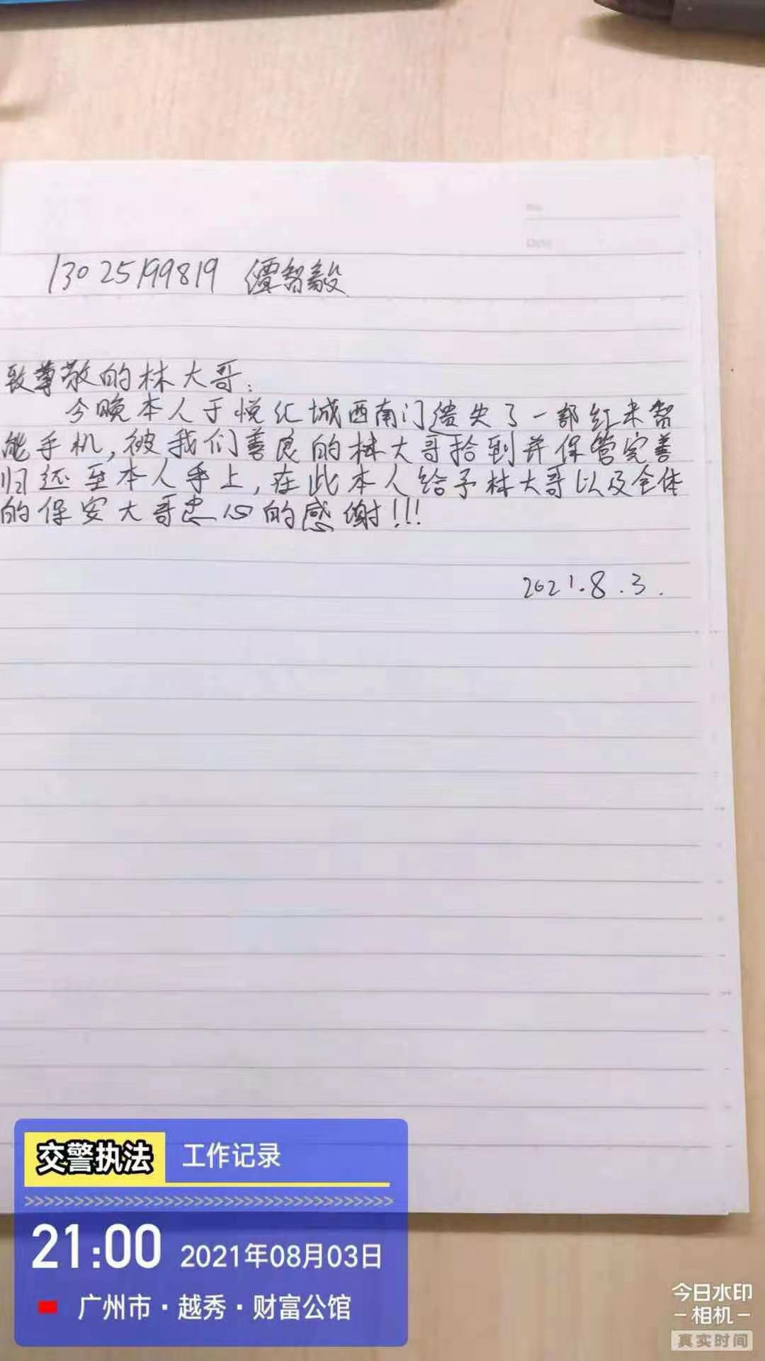 2021年8月3日,米兰官方端网站登录入口-米兰online(中国)驻西村悦汇城保安员林伟强像往常一样准备交接岗,当走至负一西南门门口的时候发现地上有一部黑色智能手机,林伟强在现场等待失主并上报了当班值班经理,不一会儿失主打电话过来,核实了失主身份后将失物归还。失主十分感动,并现场手写感谢信一封以表谢意。